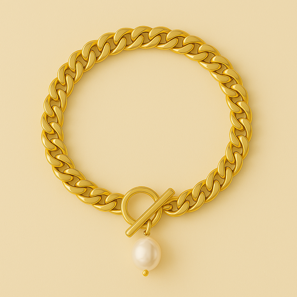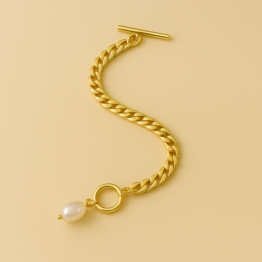 This bracelet pearl gold design reimagines the cuban link bracelet with a polished 14K gold finish and a single freshwater pearl accent at the clasp. The woven structure blends bold edges with organic softness, creating a gold charm bracelet that’s refined yet expressive. One of our signature charm bracelets for women, it pairs perfectly with pearl layering pieces.